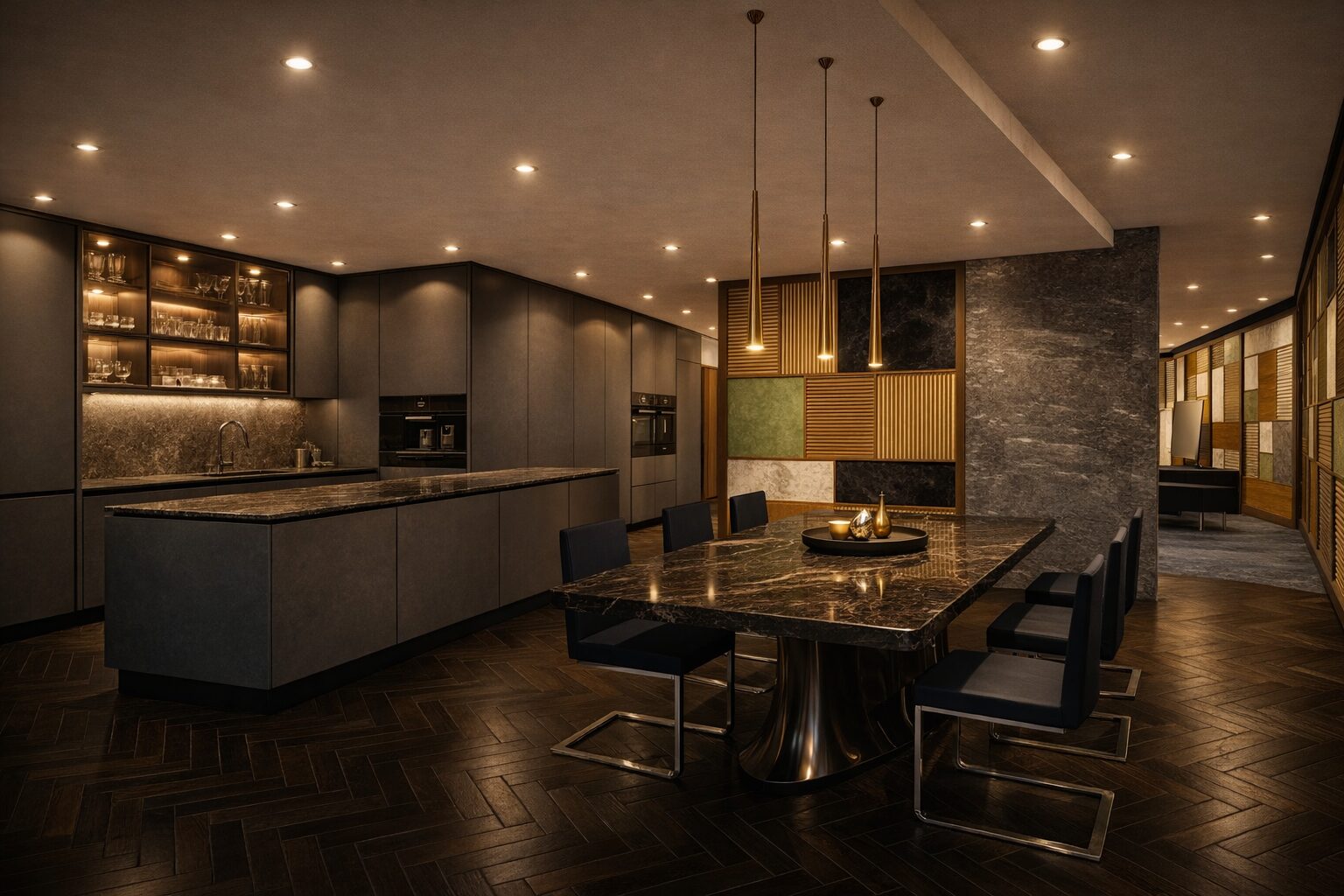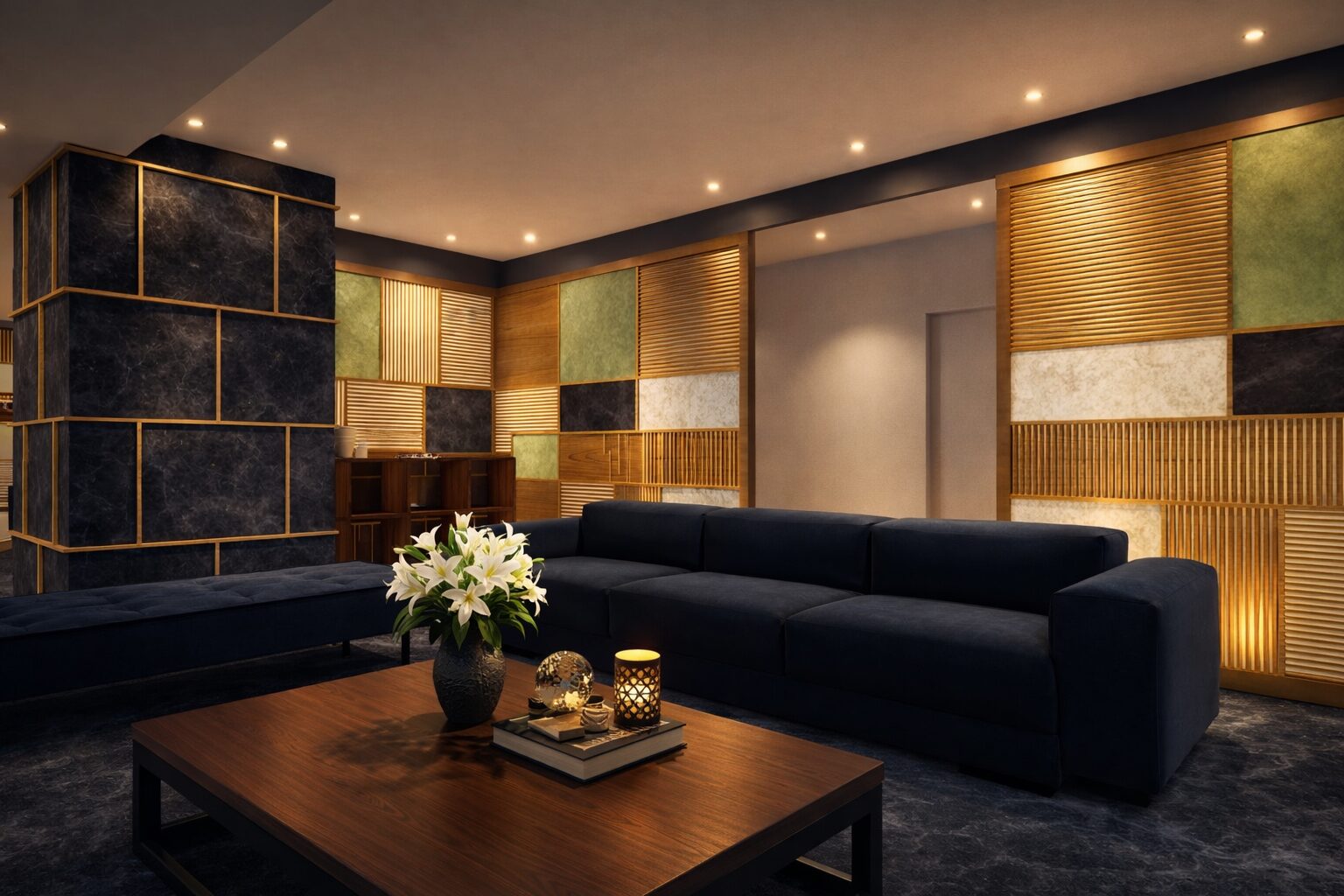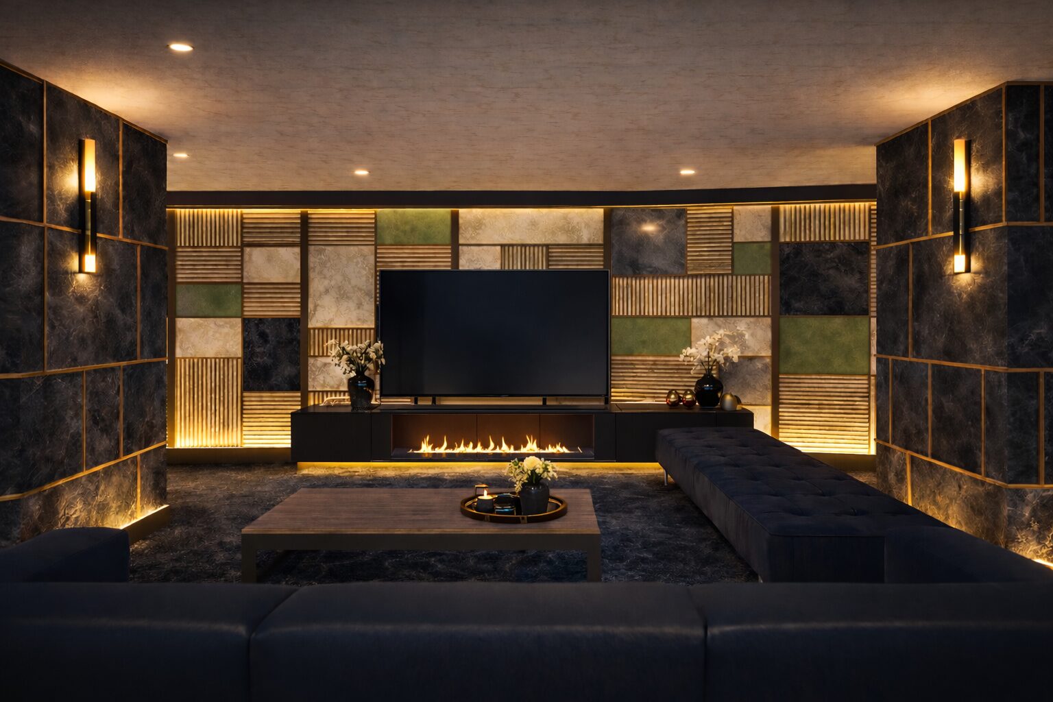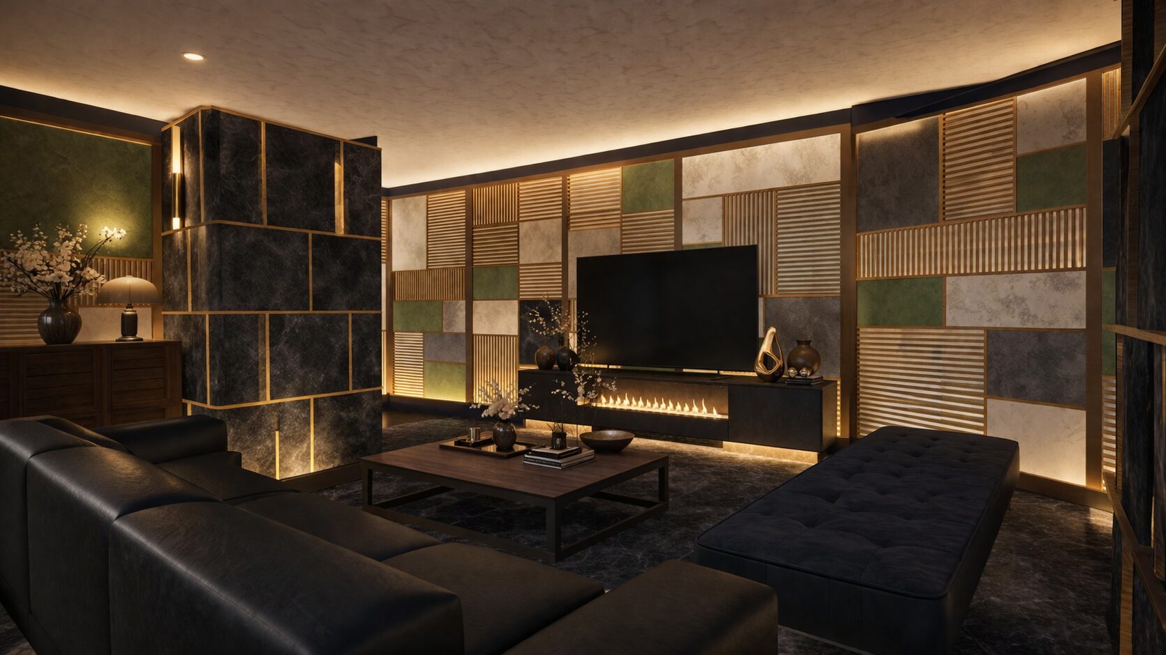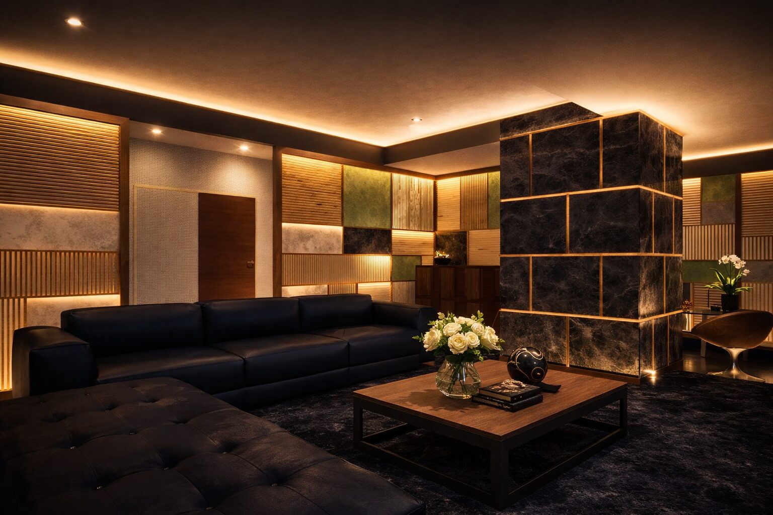 By meticulously combining these diverse textures and incorporating indirect lighting, the space is infused with a pleasant rhythm and atmosphere.