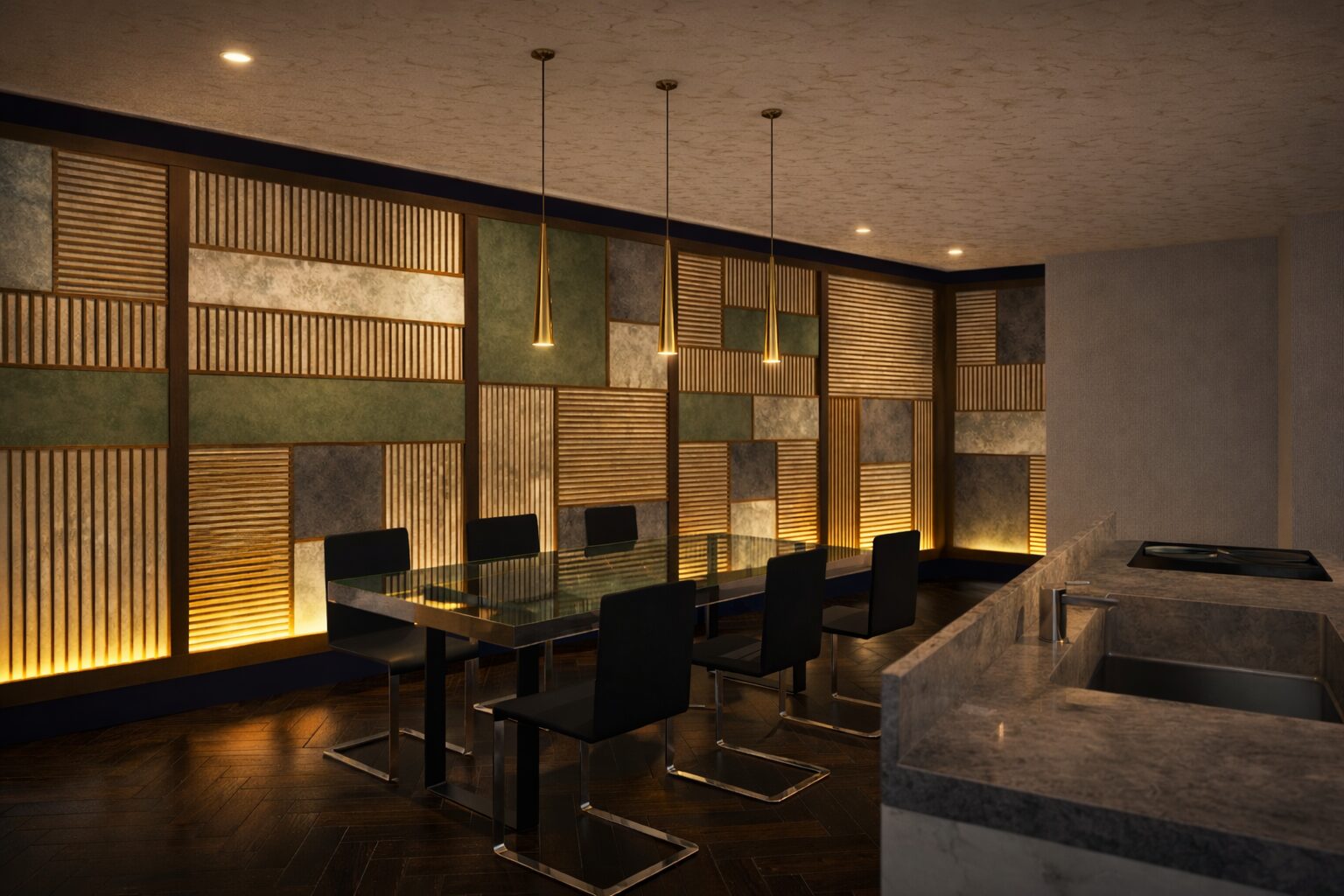 それら異なる質感を緻密に組み合わせ、間接照明を添えることで、空間に心地よいリズムと情緒を吹き込んでいる。