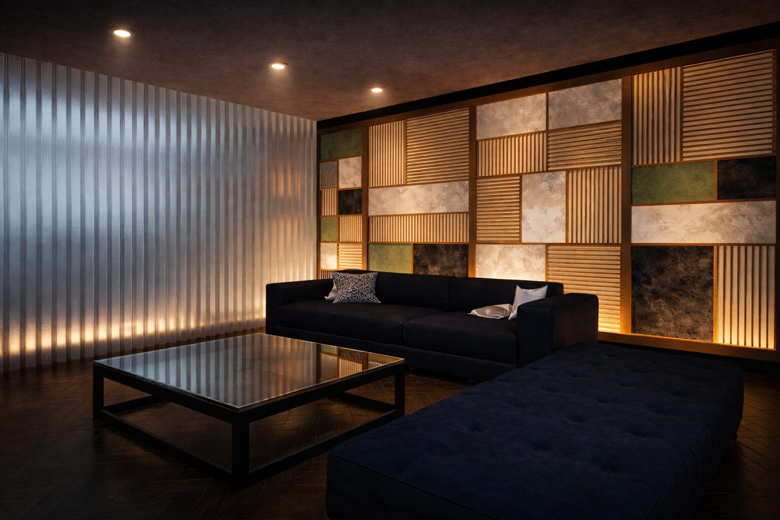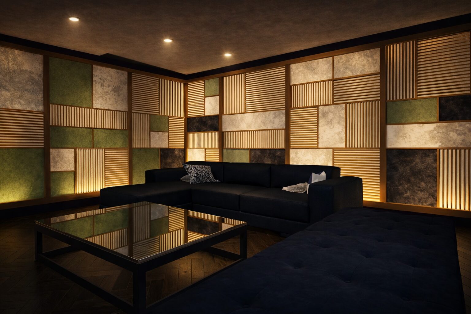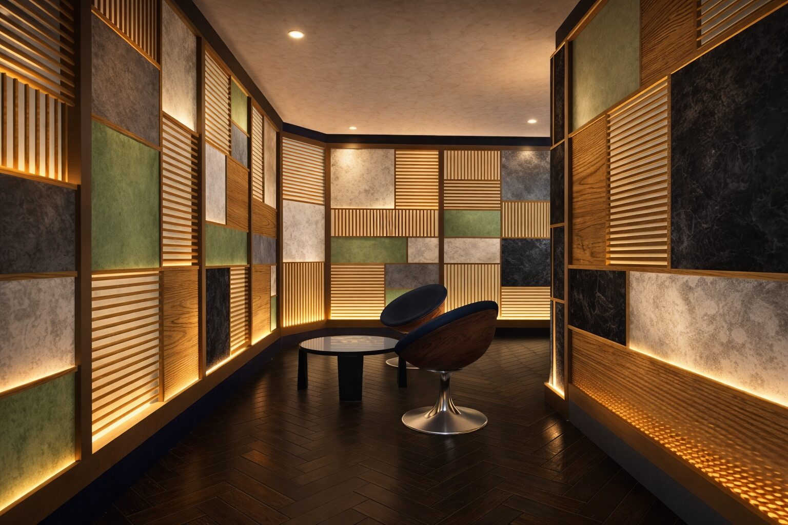 Stone cladding, latticework, and panels that radiate organic hues adorn the walls.