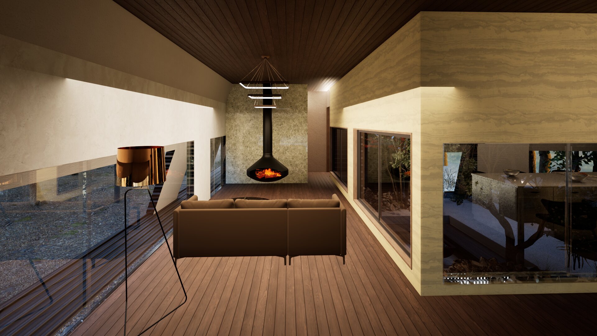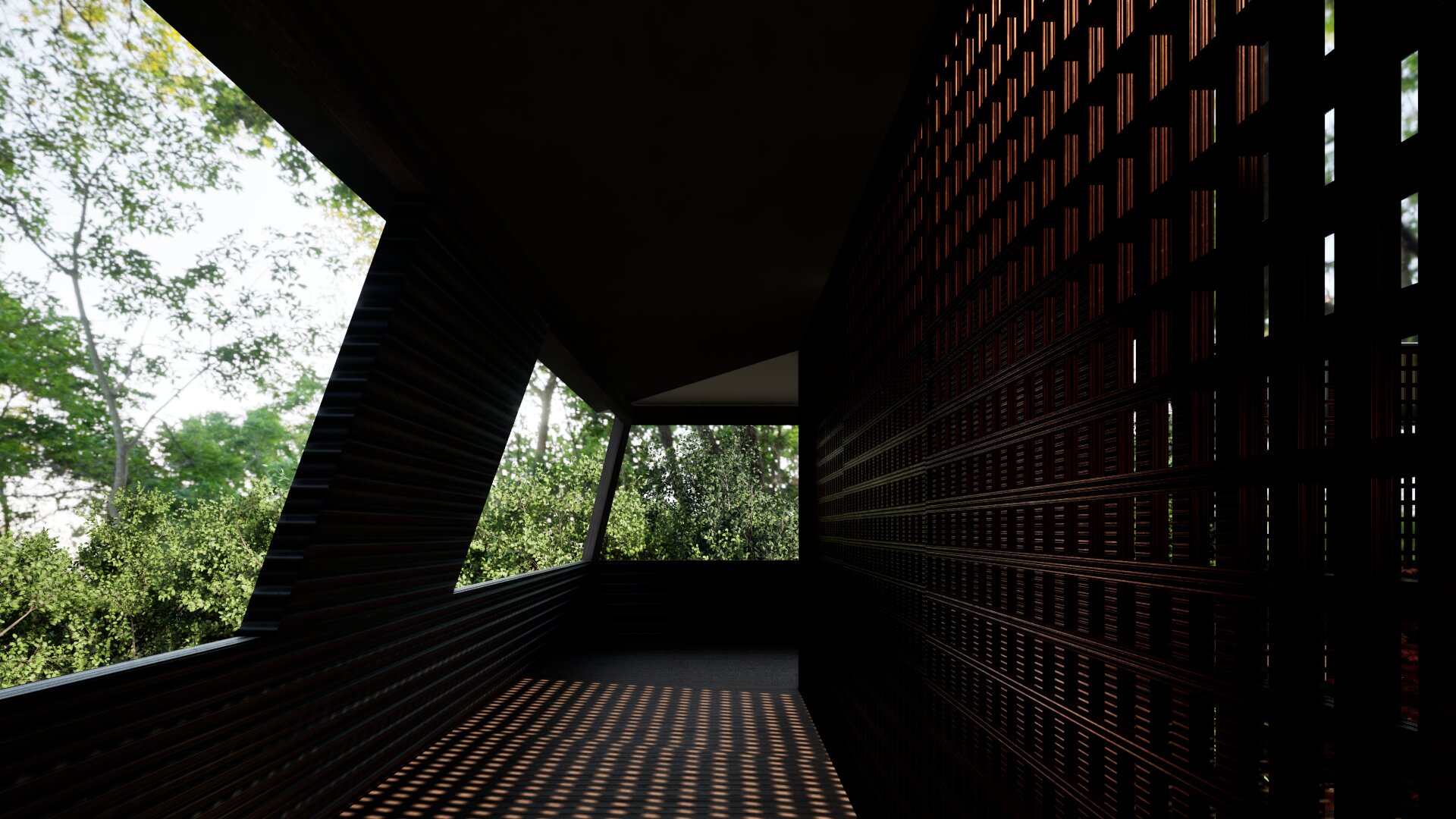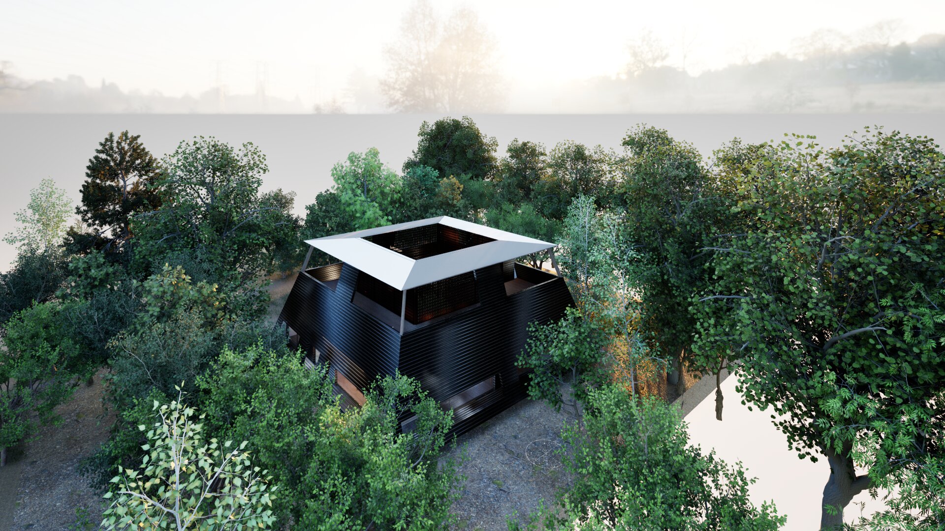 1階においては十字型のコンクリート壁を4か所に設置することにより建物の2階床面を構成する力強い構造体としている。またその囲まれたコンクリート壁の中には屋外リビングや屋外露天風呂を配置し、周囲からのプライバシーを確保できる構成としている。2階はテントテラスとなっており北に山中湖、北西に富士山を望むことができる。開口部の高さを調整しし、テント内空間から周囲の風景を切り取る事を目的としている。