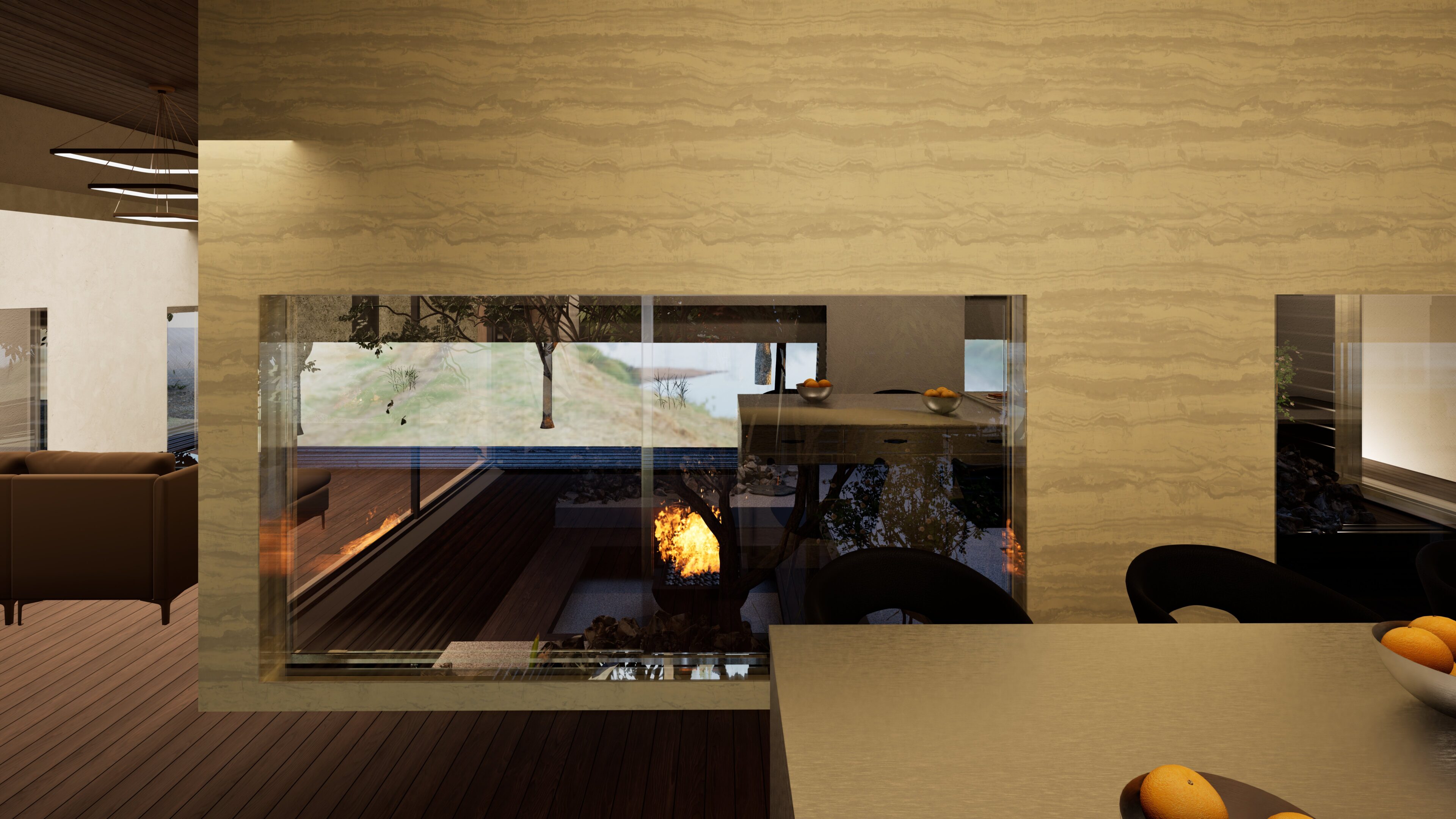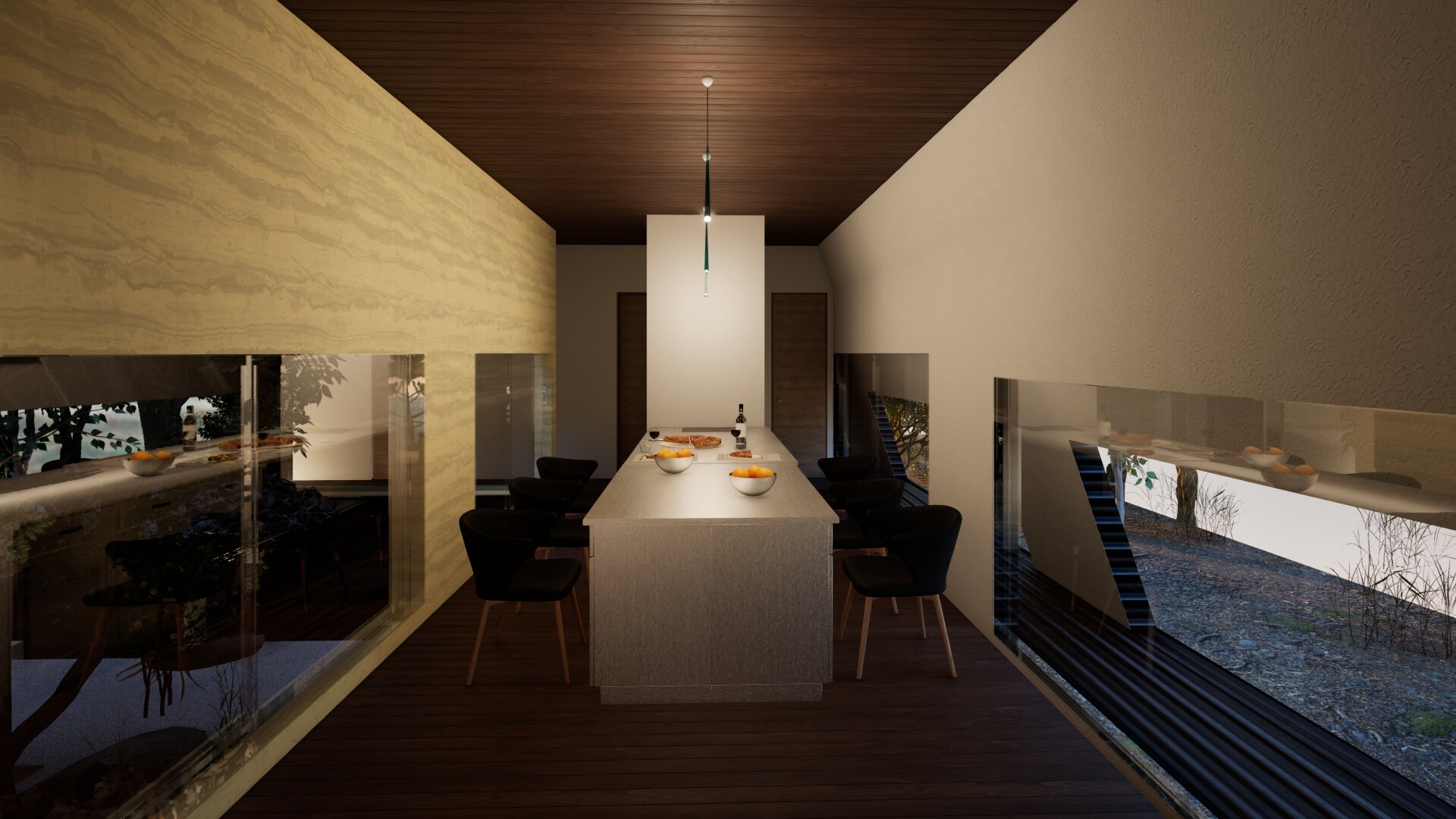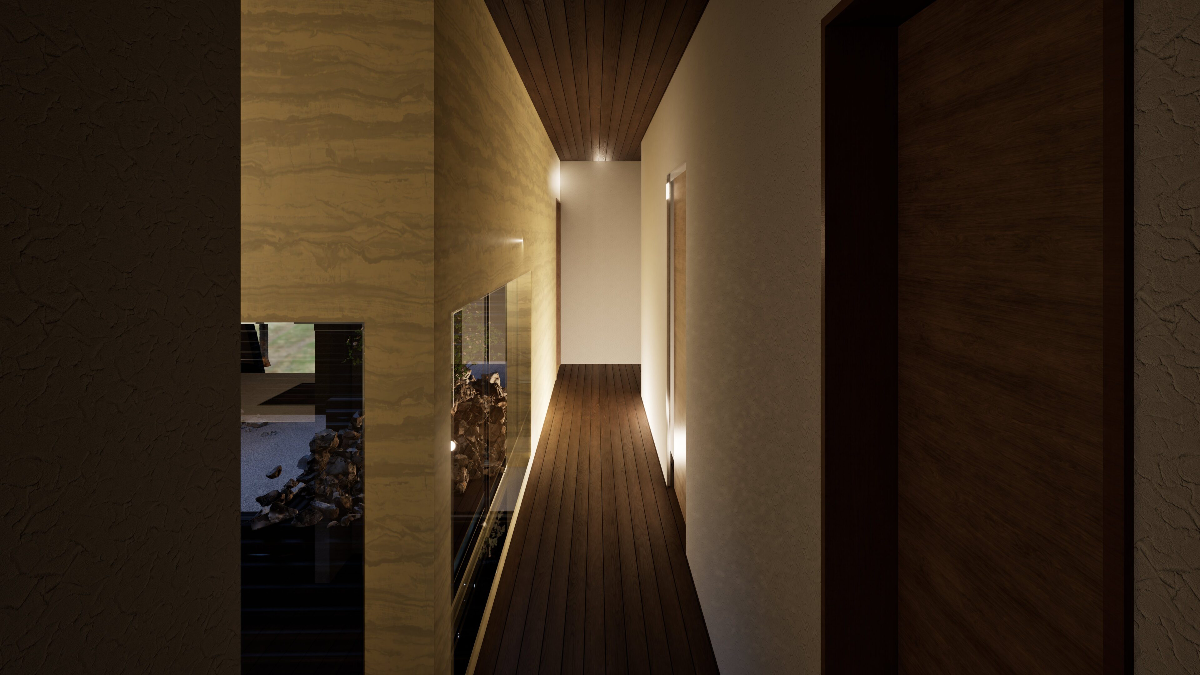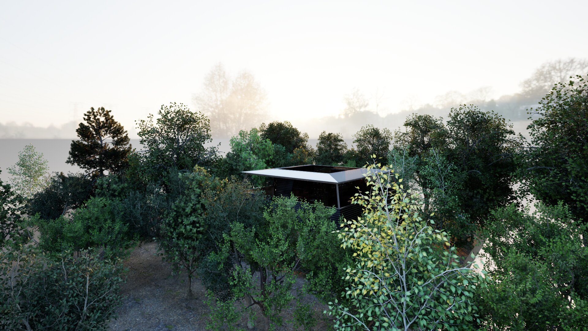 1階においては十字型のコンクリート壁を4か所に設置することにより建物の2階床面を構成する力強い構造体としている。またその囲まれたコンクリート壁の中には屋外リビングや屋外露天風呂を配置し、周囲からのプライバシーを確保できる構成としている。2階はテントテラスとなっており北に山中湖、北西に富士山を望むことができる。開口部の高さを調整しし、テント内空間から周囲の風景を切り取る事を目的としている。