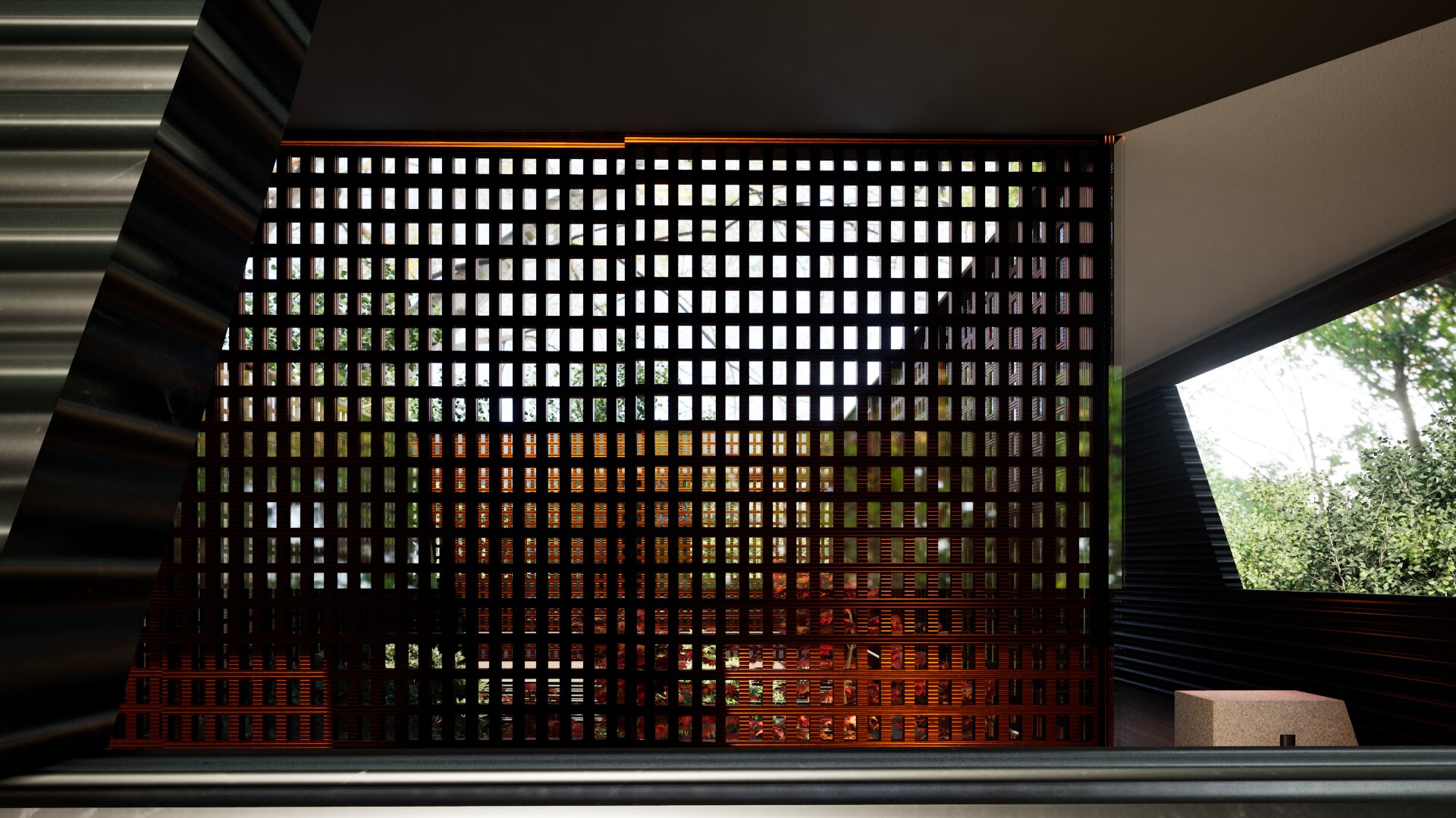 On the first floor, four cross-shaped concrete walls form a robust structural framework that constitutes the second-floor slab. These enclosed concrete walls house an outdoor living area and an open-air bath, ensuring privacy from the surroundings. The second floor features a tent-like terrace offering views of Lake Yamanaka to the north and Mount Fuji to the northwest. The height of the openings is carefully adjusted to frame the surrounding landscape from within the tented space.